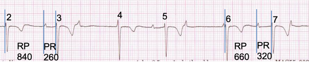 The question I asked above is: why do the PR intervals of the conducted beats vary slightly? The answer is linked to the sinus arrhythmia. The refractoriness of the AV node, and therefore its ability to conduct, depends on the time that elapses between an escape beat and the next P wave, which is assessed by the RP interval – the time between the beginning of the QRS and the beginning of the next P wave. The longer the RP interval, the longer the AV node has to recover and the better it can conduct. A long RP interval is therefore associated with a short PR interval and vice versa. This is known as RP/PR reciprocity and it is clearly demonstrated by comparing beats 3 and 7 – see below. The RP interval to beat 3 is 840 ms and the PR interval of beat 3 is 260 ms. Because of the sinus arrhythmia, the RP interval to beat 7 is only 660 ms and the PR interval consequently increases to 320 ms.