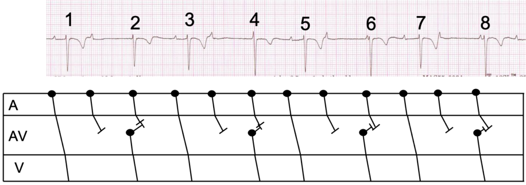 As there are never two consecutively conducted P waves, this cannot be described as either Mobitz I or Mobitz II AV block. Instead, it is a variety of second degree block that doesn’t fit comfortably into the Mobitz classification. The phenomenon we see here in which conducted beats alternate with escape beats is often described as an escape-capture bigeminy. I have tried to illustrate all of this with a laddergram, which now accompanies the 12-lead ECG.