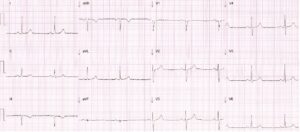 As Laura and Kathryn have worked out, this is a case of inadvertent switching of the two yellows: the left arm and V2 cables. We are all familiar with how to identify that the left arm and right arm connections have been swapped – it’s pretty obvious – but other errors of connection are more difficult to spot and I suspect they often go unrecognised. The abnormalities on this ECG, as several people have pointed out, are an abnormal R wave progression from V1 to V3 and a right axis deviation with slightly abnormal QRS morphology in some of the limb leads. Also, As Max observed, the P wave is bigger in lead I than that in lead II. The ECG as it should originally have been recorded is shown in figure 1. This allows us to see exactly what the effects were of the cable switch. In the ‘incorrect’ recording there is a slight right axis deviation, producing deep S waves in lead I and a noticeable R wave in aVR. There is also a slight leftward shift of the P wave axis. Additionally, there is discordant T wave inversion in aVF and lead III. Unusually, there is also an rsR’ complex in lead III. The most striking changes are in the chest leads, with the normal R wave progression disrupted