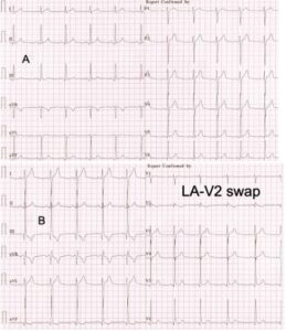 I don’t think the effects of this cable switch are well known and I’ve never read about them. However, I have come across this situation a few times and the ECG changes seen in this example seem to be pretty typical. Figures 2 and 3 are two more examples which show similar features.
