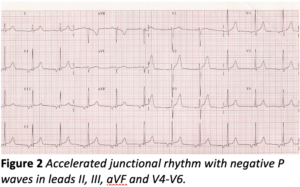 The negativity of the P waves in the inferior leads here might lead to a diagnosis of accelerated AV junctional, or low right atrial, rhythm but this would be mistaken. In an accelerated AV junctional rhythm in which the P wave precedes the QRS, the P wave is entirely negative, not biphasic, and the P wave negativity is seen in at least some of the chest leads, particularly V4-V6, as well as the inferior leads. Moreover, the P wave duration is not normally prolonged in accelerated AV junctional rhythm. For comparison, an example of accelerated AV junctional rhythm is shown in figure 2.