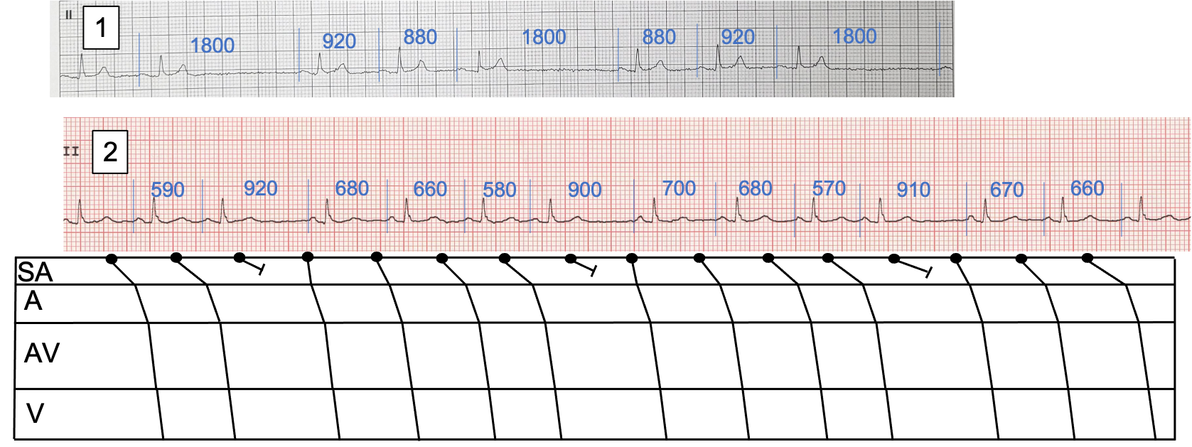 Figure 1: Rhythm strips showing PP intervals in milliseconds for ECGs 1 and 2 and a laddergram for ECG 2.