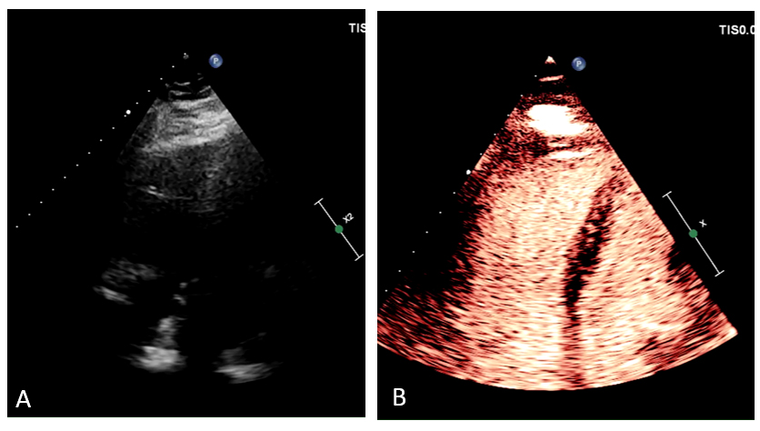Figure 1. Right Ventricular assessment without contrast (image A) and after the administration of Sonovue (image B).